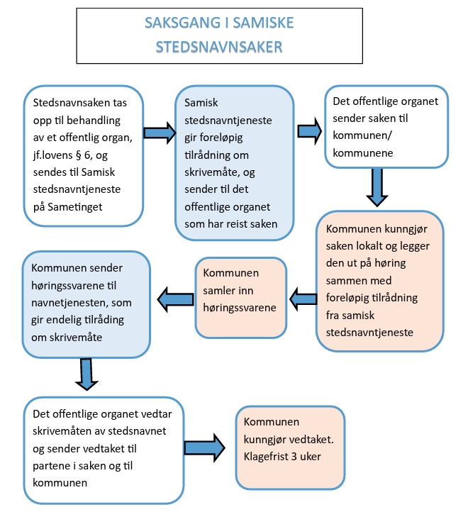 Saksgang i samiske stedsnavnsaker: Sametingets stedsnavntjeneste samler inn opplysninger om stedsnavnet og gir en foreløpig tilråding om skrivemåte. Når høringsfristen er ute går stedsnavntjenesten gjennom alle innspill og gir en endelig tilråding. Den endelige tilrådingen sendes til det offentlige organet som har myndighet til å fatte vedtak. Det offentlige organet vedtar skrivemåten av stedsnavnet og sender vedtaket til partene i saken og til kommunen.